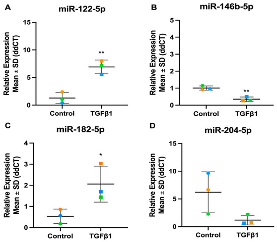 To validate the TGFβ1 miRNA-Seq results, the expression of a selected panel of significant TGFβ1 responsive miRNAs was analysed by RT-qPCR (Figure 4). The differential expression of the four miRNAs was validated by RT-qPCR: miR-122-5p (miRNA-Seq: Fold Change = 9.13, p-value = 6.15 × 10−11), miR-146b-5p (miRNA-Seq: Fold Change = 0.48, p-value = 1.96 × 10−6), miR-182-5p (miRNA-Seq: Fold Change = 1.75, p-value = 0.02) and miR-204-5p (miRNA-Seq: Fold Change = 0.52, p-value = 9.46 × 10−5), correlate to the expression patterns shown in the miRNA-Seq data set, confirming the reliability of the sequencing experiment.
