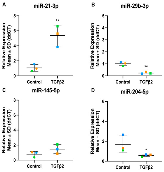 To validate the TGFβ2 miRNA-Seq results, the expression of a selected panel of significant TGF2-responsive miRNAs was analysed by RT-qPCR (Figure 8). The differential expression of the four miRNAs was validated by RT-qPCR: miR-21-3p (miRNA-Seq: Fold Change = 2.01, p-value = 1.26 × 10−16), miR-29b-3p (miRNA-Seq: Fold Change = 0.81, p-value = 0.04), miR-145-5p (miRNA-Seq: Fold Change = 1.51, p-value = 4.34 × 10−8) and miR-204-5p (miRNA-Seq: Fold Change = 0.82, p-value = 0.01), correlate to the expression patterns shown in the miRNA-Seq dataset, again confirming the reliability of the sequencing experiment.