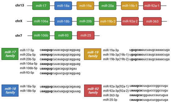 The structure of the miR-17-92 family along with its two paralogs: miR-106a-363 and miR-106b-25. The miR-17-92 cluster is located on chromosome 13 and consists of miR-17, miR-18a, miR-19a, miR-19b-1, miR-20a, and miR-92a-1. The miR-106a-363 cluster is located on chromosome X and consists of miR-106a, miR-18b, miR-20b, miR-19b-2, miR-92a-2, and miR-363. The third cluster is miR-106b-25 consisting of miR-106b, miR-93, and miR-25. These fifteen miRNAs can be grouped into four seed families: miR-17, miR-18, miR-19, and miR-92 families.