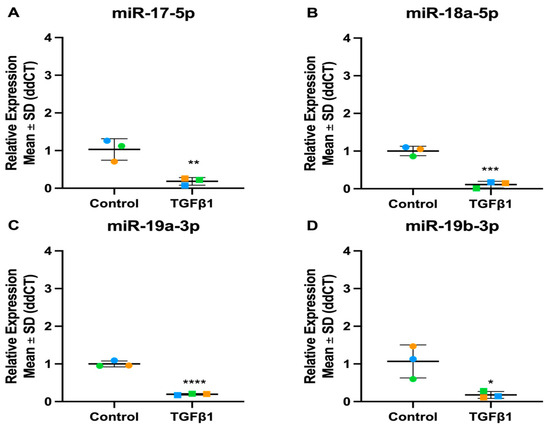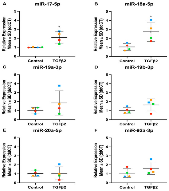 The miR-17-92 family is encoded by the MIR17HG gene, which is transcribed as a polycistronic transcript that produces six mature miRNAs: miR-17, miR-18, miR-19a, miR-19b, miR-20, and miR-92 (Figure 9) [56]. Interestingly, we identified the miR-17-92 family as differentially expressed in TM cells following both TGFβ1 and -β2 stimulation. One striking difference we found between the TGFβ1 and TGFβ2 datasets was that TGFβ1 treatment appeared to have a larger effect on the family members. To confirm the differential expression of this family in TM cells, we performed RT-qPCR, treating the cells with either TGFβ1 or TGFβ2. In TGFβ1-treated TM cells, the RT-qPCR results followed the same trend as the miRNA-Seq data, apart from miR-20a-5p which showed donor variability. The RT-qPCR results in TGFβ2-treated TM cells were less significant, which followed the pattern found in the miRNA-Seq data. miR-17-5p and miR-18a-5p were both significantly up-regulated, like the miRNA-Seq data, while the rest of the family were not significantly altered (Table 5 and Figure 9, Figure 10 and Figure 11).