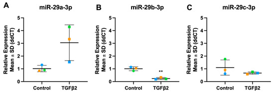 Expression levels of miR-29 family in TGFβ2-stimulated TM cells. (A) hsa-miR-29a-3p (B) hsa-miR-29b-3p (C) hsa-miR-29c-3p. Vehicle controls are denoted as “Control” on graphs and TGFβ2 treated cells as “TGFβ2”. Individual values for donors 1, 2, and 3 are shown. Data were normalised to U6 control and analysed using the ΔΔCt method. Circles represent individual donor gene without TGFβ2 treatment and squares represent donors with TGFβ2 treatment. The colour of circle or square represents the individual donor human primary TM cells. An asterisk denotes significant differential gene expression after treatment (** = p < 0.005).