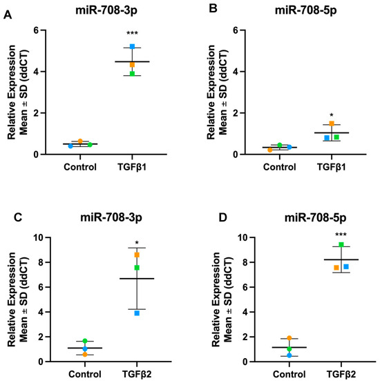 Expression levels of miR-708-5p and miR-708-3p in TGFβ1 and β2-stimulated TM cells. (A) hsa-miR-708-3p with TGFβ1 (B) hsa-miR-708-5p with TGFβ1 (C) hsa-miR-708-3p with TGFβ2 (D) hsa-miR-708-5p with TGFβ2. Individual values for donors 1, 2, and 3 are shown. Data were normalised to U6 control and analysed using the ΔΔCt method. Circles represent individual donor gene without TGFβ treatment and squares represent donors with TGFβ treatment. The colour of circle or square represents the individual donor human primary TM cells. An asterisk denotes significant differential gene expression after treatment (* = p < 0.05, *** = p < 0.0005).