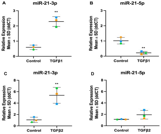 Expression levels of miR-21-3p and miR-21-5p in TGFβ1 and β2-stimulated TM cells. (A) hsa-miR-21-3p with TGFβ1 (B) hsa-miR-21-5p with TGFβ1 (C) has-miR-21-3p with TGFβ2 (D) has-miR-21-5p with TGFβ2. Individual values for donors 1, 2, and 3 are shown. Data were normalised to U6 control and analysed using the ΔΔCt method. Circles represent individual donor gene without TGFβ1 treatment and squares represent donors with TGFβ1 treatment. The colour of circle or square represents the individual donor human primary TM cells. An asterisk denotes significant differential gene expression after treatment (** = p < 0.005).