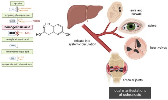 A malfunctioning HGD enzyme (indicated with a red cross) in the tyrosine metabolic pathway (left) causes accumulation of HGA. The drug nitisinone (NTBC) inhibits the upstream 4-HPPD enzyme, thereby blocking HGA production. In untreated AKU, excess HGA is released (mostly from the liver) into systemic circulation and delivered to target tissues, leading to ochronosis (i.e., deposition of a black, melanin-like pigment). Ochronosis affects several body compartments (right), with serious consequences especially for load-bearing articular joints, heart valves, and aortic vessels. Enzyme abbreviations: TA, tyrosine aminotransferase; 4-HPPD, 4-hydroxyphenylpyruvate dioxygenase; HGD, homogentisate 1,2-dioxygenase; MAAI, maleylacetoacetate isomerase; FAA, fumaryl acetoacetase. Created with BioRender.com (https://www.biorender.com/, accessed on 17 June 2024).