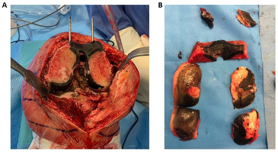 The knee of an AKU patient during arthroplasty (A). Ochronosis involves the whole joint, including ligaments and tendons that appear black; the cartilage is extremely thin, brittle, and fragile (B).