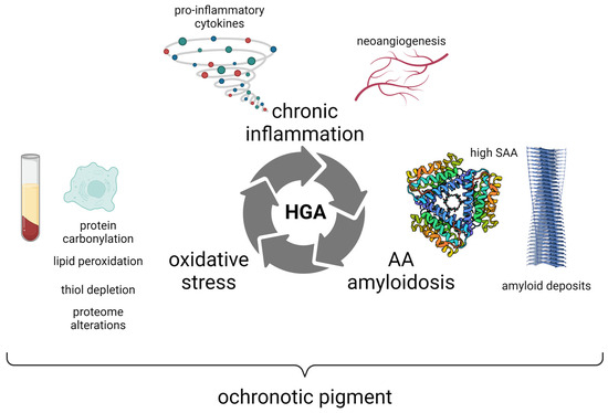 In AKU, oxidative stress, chronic inflammation, and secondary (AA) amyloidosis are strictly interconnected in a vicious cycle linked to the production and deposition of the ochronotic pigment derived from HGA. Created with BioRender.com (https://www.biorender.com/, accessed on 17 June 2024).