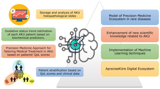 In this context, the need of a multidisciplinary, interactive, and integrated database for AKU arose in the last years, leading to ApreciseKUre (www.bio.unisi.it/aprecisekure/, accessed on 17 June 2024; www.bio.unisi.it/aku-db/, accessed on 17 June 2024), a digital platform containing data on more than 210 AKU subjects from all over the world. Stored data include patient-derived information related to QoL, medical/research data, and HGD mutations [127]. With up to 110 fields per record, 82 numerical attributes, and 8 Booleans (the remaining fields being categorical values), ApreciseKUre is an easily accessible reference database for AKU. It also integrates computational predictive models able to investigate the health status of AKU patients even when mechanistic relationships between model variables cannot be determined. Figure 4 summarizes all the data analysis techniques, ranging from more common statistical data mining to deeper machine learning models, that are available so far in ApreciseKUre. Several models were implemented in ApreciseKUre with different goals, as follows [128]: