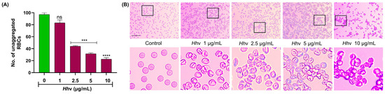 Hhv-induced crenation and aggregation of RBCs. (A) Semi-quantitative estimation of RBCs aggregation. Washed RBCs were treated with increasing doses of Hhv (0–10 µg/mL) for 1 h at 37 °C. Free unaggregated RBCs remaining are estimated in 2–3 different fields of view. (B) Corresponding brightfield microscopic images of cells stained using Giemsa-stain. PBS-treated cells served as a negative control. After treatment, cells were stained using Giemsa stain and observed under the microscope using 40× magnification. The area enclosed by the black box in the top panel is magnified and shown below. Scale bar 30 µm. The data were presented as mean ± SEM (n = 3) and analyzed using ordinary one-way ANOVA followed by Tukey’s multiple comparisons test, ‘****’ p < 0.0001, ‘***’ p < 0.001, and ns (non-significant) > 0.05 compared to the PBS-treated cells.