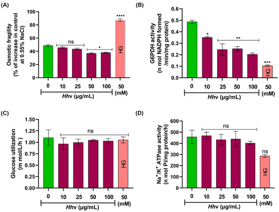 Effect of Hhv on membrane integrity and metabolic functions of RBCs. (A) Measurement of osmotic fragility. (B) Determination of G6PDH activity. (C) Estimation of glucose utilization in RBCs by GOD-POD method. (D) Estimation of Na+/K+ -ATPase activity in RBCs membrane. In all the cases, the washed RBCs were independently treated with increasing doses of Hhv (0–100 µg/mL) for 1 h at 37 °C. The PBS-treated samples served as negative control. High glucose (HG) 50 mM served as a positive control. The data are presented as mean ± SEM (n = 3) and analyzed using ordinary one-way ANOVA followed by Tukey’s multiple comparisons test, ‘****’ p < 0.0001, ‘***’ p < 0.001, ‘**’ p < 0.01, ‘*’ p < 0.05 and ns (non-significant) > 0.05 compared to the PBS-treated cells.