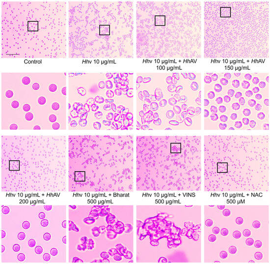 Neutralization/non-neutralization efficacy of Hhv-induced RBCs aggregation by anti-venoms and NAC. Bright-field microscopic images of cells stained using Giemsa stain. Hhv (10 µg/mL) was independently pre-treated with various doses (0–500 µg/mL) of anti-venoms (Bharat, VINS, and HhAV) and NAC (0–500 µM) for 10 min at RT before treatment. These reaction mixtures were treated independently to washed RBCs and incubated for 1 h at 37 °C. PBS-treated cells served as a negative control. After treatment, cells were stained using Giemsa stain and observed under the microscope using 40× magnification. The area enclosed by the black box in the top panel is magnified and shown below, scale bar of 30 µm. The data are presented as mean ± SEM (n = 3).