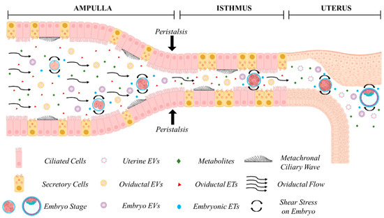 In vivo embryo development in the maternal tract. Cross-talk between the embryo and the maternal tract. Oviductal, endometrial, and embryonic secretions in the form of embryotropins (ETs) and various signaling factors, enveloped or less in extracellular vesicles (EVs), are concentrated in a confined environment. Secretion of maternal fluids, metachronal ciliary waves, and peristaltic contractions exert biomechanical forces on the developing embryo during its journey through the ampulla, isthmus, and the uterus. Figure created with BioRender.com (accessed on 11 April 2024).