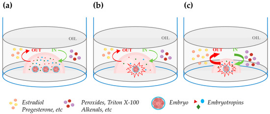 Impact of embryo density during in vitro culture in drops under oil. (a) Group embryo culture in a defined volume of culture medium improves embryo development due to an enhanced concentration of embryotropins (triangles, circles, and diamonds). The green and red curved arrows, respectively, indicate unwanted in (peroxides, Triton X-100, alkenals, etc.) and out (estradiol, progesterone, etc.) apolar solute exchanges between oil and medium. (b) Individual embryo culture within the same drop volume as in the figure (a): embryo development is compromised due to the reduced concentration of embryotropins. (c) Individual embryo culture in a reduced drop volume: embryotropins are more concentrated than in (b) and the increase in the drop surface exposed to oil relative to the drop volume exacerbates the unwanted in and out exchanges between the oil and medium, impairing embryo development. Figure created with BioRender.com (accessed on 11 April 2024).