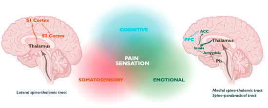 Scheme of the main ascending pathways for pain perception. S1: primary somatosensory cortex; S2: secondary somatosensory cortex; ACC: anterior cingulate cortex; PFC: prefrontal cortex; Pb: parabrachial nucleus. The spino-thalamic tract of the lateral pathway controls the somatosensory component of pain (in red). The spino-thalamic tract of the medial pathway associated with the spino-parabrachial tract controls the emotional component of pain (in green).