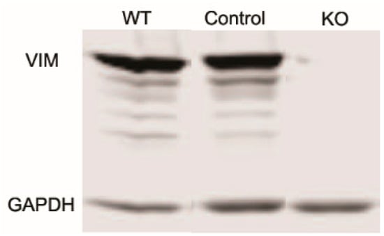 Western blot showing a lack of vimentin protein expression in vimentin knockout (KO) cells as compared to wild-type (WT) and controls.