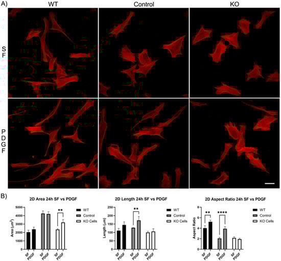 Our first set of experiments was carried out on 2D substrates with media containing PDGF or serum-free (SF) basal media. Cells were incubated for 4 and 24 h. After just 4 h of incubation, wild-type cells, editing control cells, and Vim KO cells were all able to spread normally in SF media (Figure 2A). Although, the cell area for the editing control cells was significantly higher than the cell area of wild-type and Vim KO cells (Figure 2B). The addition of PDGF-BB induced an increase in cell length and/or the degree of elongation (aspect ratio) in wild-type and control cells, consistent with previous studies. However, Vim KO cells did not show significant elongation in response to PDGF.