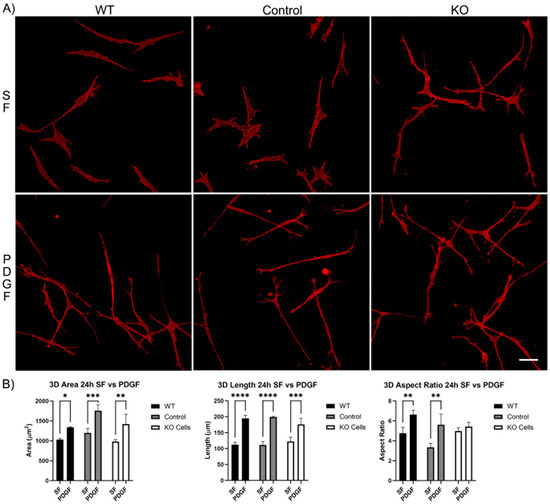 Vim KO cell spreading in 3D collagen matrices for 24 h in the presence of PDGF and SF media. (A) Representative pictures of samples that were fixed and labeled for F-actin. Scale bar is 50 μm. (B) Graphs are morphological data from 3 different experiments. (* p < 0.05, ** p < 0.01, *** p < 0.001, **** p < 0.0001).