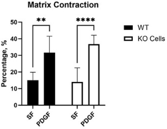 Cells exert tractional forces on the matrix during spreading. To test if Vim KO cells exert similar amounts of tractional force as wild-type cells, we used a collagen matrix contraction assay. In this assay, the height of an attached collagen matrix is reduced over time due to cell-induced matrix reorganization. Interestingly, wild-type and KO cells induced similar amounts of matrix contraction in SF media, and a significant increase was observed in response to PDGF in both cell types (Figure 5).