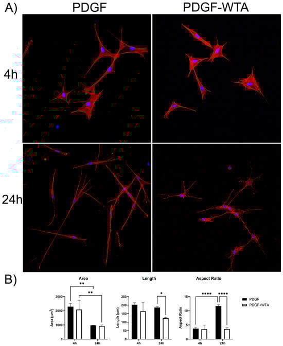 (A) Representative pictures of initial cell spreading of corneal fibroblasts cultured on 2D collagen-coated dishes. Cells were cultured for 4 and 24 h with media containing PDGF BB or PDGF BB + 2 µM WTA to block vimentin polymerization. After incubation, samples were fixed and stained for F-Actin (red), Nuclei (blue). Image width is 465 µm. (B) Graphs are data from 3 different experiments. (* p < 0.05, ** p < 0.01, **** p < 0.0001).