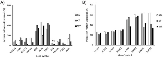 As shown above, Vim KO cells expressed αSMA protein when cultured with TGFβ, albeit at lower levels than controls. Next, we wanted to investigate whether Vim KO cells express other proteins associated with myofibroblast transformation of wild-type cells. To answer this question, we conducted proteomics analysis of Vim KO, control, and wild-type cells following culture in TGFβ. TGFβ is a growth factor known to induce myofibroblast transformation in vivo and is produced by macrophages, epithelial cells, and fibroblasts in many organs and tissues [33]. TGFβ is also known to promote expression of extracellular matrix (ECM) proteins such as collagen 1 and V, fibronectin, and the proteoglycans biglycan and versican, all of which are involved in wound repair and remodeling [33,34,35]. In addition, TGFβ is known to upregulate tropomyosins, proteins which are responsible for incorporating αSMA into stress fibers [36]. TGFβ also increases the induction of connective tissue growth factor, a potent stimulator of myofibroblast differentiation and ECM production [37].