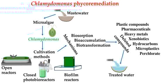 Phycoremediation (where ‘phyco’ means algae in Greek) is a sustainable and environmentally friendly approach that utilizes various types of algae, including cyanobacteria, microalgae, and macroalgae, to remove or extract pollutants from wastewater (Figure 1). Among the benefits of phycoremediation are the removal of nutrients and xenobiotic substances, the reduction in excess nutrients from effluent with high organic material, CO2 mitigation, the treatment of effluents with heavy metal ions, and the monitoring of potentially toxic substances using algae as biosensors [28]. Microalgae have the ability to absorb and break down contaminants through processes such as biosorption, bioaccumulation, and biotransformation [29]. Phycoremediation not only helps in the removal of pollutants but also results in the production of algal biomass, which can be utilized for various valuable products such as food, feed, fertilizers, pharmaceuticals, and biofuels [30]. A wide range of non-pathogenic algae are utilized for wastewater treatment, such as Chlorella sp., Spirulina sp., Scenedesmus sp., Nostoc sp., and Oscillatoria sp., [31]. In this review, we will focus on those studies that use Chlamydomonas in phycoremediation.