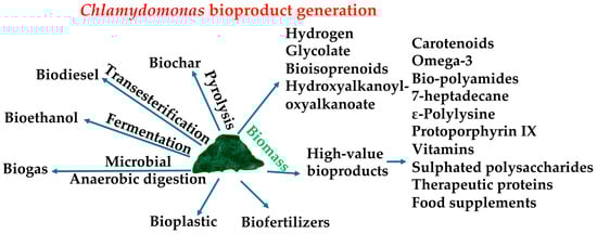 One of the main products derived from the cultivation of microalgae is their biomass, as it is used as raw material for obtaining other derived bioproducts. It would be highly beneficial economically to use the biomass resulting from the bioremediation process for bioproduct purification. However, the utilization of biomass derived from wastewater treatment encounters several inherent challenges. These challenges include the scalability of biomass production, the presence of xenobiotics and heavy metals, as well as the contamination with bacteria, fungi, and viruses, all of which limit their extensive application [97]. Although numerous efforts are being made to address this issue, the production of the main bioproducts obtained from microalgae still does not use wastewater as a cultivation source. Next, we will present studies that utilize Chlamydomonas to obtain certain bioproducts, some of which use biomass derived from wastewater remediation.
