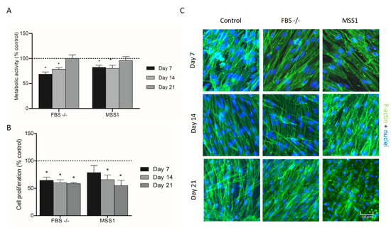 (A) Metabolic activity, (B) cell proliferation, and (C) immunostaining of F-actin cytoskeleton (green) and nuclei (blue) in DPSC cultures subjected to different treatment conditions: full FBS supplementation (Control), FBS deprivation (FBS -/-), and FBS deprivation coupled with MSS1 peptide exposure at 1 µM (MSS1), for 7, 14, and 21 days. * Significantly different from the positive control group, p < 0.05. For panels A and B, control values are normalized to 100%; FBS -/- and MSS1 conditions are evaluated relative to this benchmark.