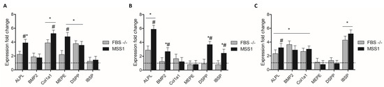 Gene expression analysis of early-stage cultures (day 7) (Figure 2A) revealed a general trend for increased expression of all genes under FBS-deprived conditions, with COL1A1 and DSPP showing significant upregulation. The exposure to MSS1 further induced the expression of ALPL, COL1A1, and MEPE, while the expression profiles of other genes remained comparable to those observed in FBS-deprived conditions. At day 14 (Figure 2B), FBS deprivation significantly upregulated ALPL expression. MSS1 exposure not only significantly increased the expression of ALPL, but also of BMP2, DSPP, and IBSP, as compared to the control and FBS-deprived conditions. Lastly, at day 21, in FBS-deprived conditions, the expression of ALPL, BMP2, COL1A1, and IBSP was increased. Notably, MSS1 treatment led to a significant upsurge in ALPL expression, surpassing levels observed under FBS deprivation (Figure 2C).