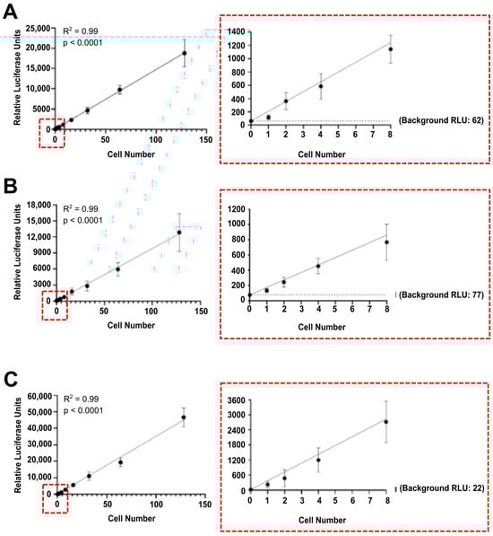 Adherent cells were trypsinized, centrifuged (300× g), and resuspended in PBS (1X). Cell numbers were established by direct counting using a Neubauer chamber. Cell suspensions were then diluted to obtain eight dilution points ranging from 1 to 128 cells per 50 μL PBS (1X). Cells were lysed using Cell Culture Lyses Reagent (Promega, Madison, WI, USA) (30 min; 4 °C) and the luciferase activity was quantified in a 96-well opaque reading plate. A GloMax® 96 Microplate Luminometer (Promega, Madison, WI, USA) was used to detect and quantify the bioluminescence resulting from automated injection of Luciferase Assay Kit (Promega, Madison, WI, USA). Luciferase activity is represented throughout this study as relative luciferase units (RLU).