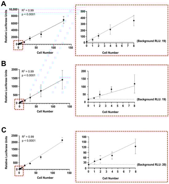 Luciferase enzymes have been widely used to label immortalized cell lines [28,36,37,38,39,40,41]. Here, we aimed at developing a highly sensitive and robust method for the detection and quantification of single tumour cells. To this end, we stably transfected human breast cancer cells (MDA-MB-231 and MCF7 cell lines) with pCMV-Gluc-KDEL plasmid vector and murine mammary carcinoma cells (4T1 cell line) with pGL4.51[luc2/CMV/Neo] plasmid vector. Successful transfection was confirmed by clonal selection. Specifically, single cells were seeded in 96-well plates (0.5 cell/well), clones were grown independently and evaluated for luciferase activity. Clones with the highest luciferase activity were selected, expanded, and used in the following analyses. Next, we quantified the luciferase activity per cell to evaluate the repeatability and sensitivity of our method. Luciferase-labelled cells resuspended in PBS were serially diluted to a single cell and lysed, and the luciferase activity was quantified in vitro. As expected, a strong positive correlation was observed between cell numbers and luciferase activity for MDA.Gluc (Figure 1A), MCF7.Gluc (Figure 1B), and 4T1.Fluc (Figure 1C) cells. Moreover, as observed for all cell lines evaluated, the luminescence quantified in wells containing a single luciferase-labelled cell was significantly higher than that detected in blank solution (background) (Figure 1). These results confirm the reproducibility, sensitivity, and accuracy of our method for the detection and quantification of luciferase-labelled tumour cells in vitro.