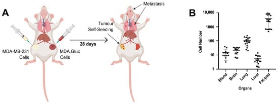 After confirming the elevated sensitivity of our method and developing a standard curve that represents the correlation between the luciferase activity and the number of cells spiked into blood, brain, lung, liver, and mammary fat pad samples, we next sought to validate this method in vivo. To achieve this aim, highly metastatic MDA-MB-231 cells were used as a model. Specifically, 3 × 106 MDA.Gluc cells and 1 × 106 wild type (unlabelled) MBA-MB-231 cells were contralaterally implanted into the mammary fat pads of NOD-SCID mice (Figure 3A). Twenty-eight days post-tumour inoculation, animals were humanely killed, blood and organ samples were harvested, and the luciferase activity was quantified in sample lysates. Cell numbers and experiment duration were defined considering our previous studies [37,38] to compensate for the differences in the growth of wild type and luciferase-labelled cells. Remarkably, luciferase activity was detected above background levels in all samples analysed (Figure 3B), conclusively demonstrating the progression of primary tumours towards invasion, intravasation, extravasation, and colonization of secondary organs. Furthermore, normalization of the RLU quantified in each blood sample analysed showed a range of 3–40 CTCs per 5 μL of blood (Figure 3B), confirming the rarity levels of such a cell population as previously described [21,22,46]. Interestingly, a similar range of luciferase-labelled cells was also detected in brain samples (6–34 cells per 5mg of brain sample) (Figure 3B). These results highlight that metastatic MDA-MB-231 breast cancer cells are capable of re-seeding and colonizing this organ quickly after primary tumour formation, as also reported by our group in previous studies [37,38]. Lung samples, however, were abundantly colonized by metastatic cells, and a range of 20–235 luciferase-labelled MDA-MB-231 cells were detected per 5 mg of lung (Figure 3B). Surprisingly, although the liver is typically ranked among the main sites targeted by breast cancer metastasis [47,48,49], only 2–14 tumour cells were detected per 5 mg of liver sample (Figure 3B). Conversely, tumour self-seeding was confirmed as a major event in this orthotopic breast cancer model, as 467–9290 luciferase-labelled tumour cells were quantified per 5 mg of unlabelled tumour (Figure 3B). These results establish the feasibility of using our method for the investigation of cancer progression as we provide a robust model for the analysis of the early stages of the metastatic cascade, thus addressing a critical issue in existing mouse cancer models.