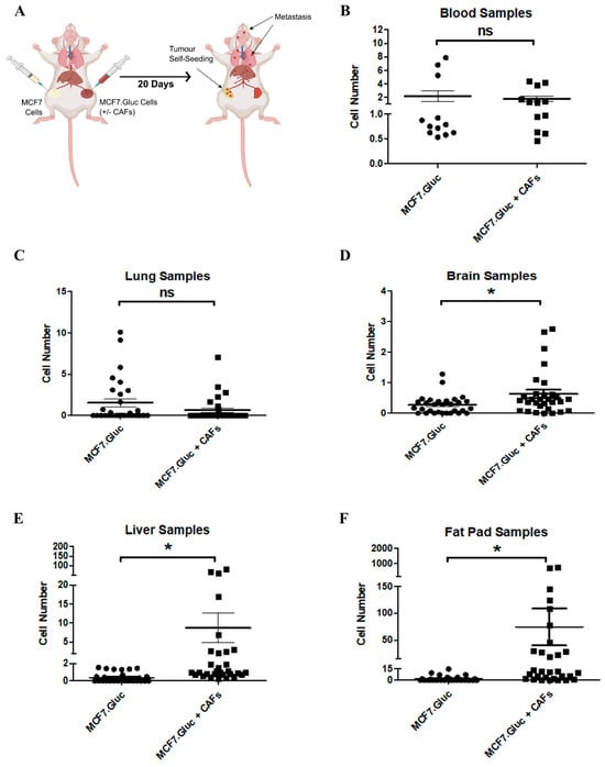 Luciferase-labelling allows ex vivo quantification of the dissemination of poorly metastatic MCF7 breast cancer cells. (A) Schematic representation of the orthotopic and contralateral breast cancer mouse model used in this study. Created with BioRender.com accessed on 26 April 2024. 5 × 106 wild type (unlabelled) MCF7 and 5 × 106 of MCF7.Gluc cells (±1.5 × 106 CAFs) were orthotopically inoculated in contralateral mammary fat pads. (B–F) Ex vivo quantification of luciferase activity in (B) blood, (C) lung, (D) brain, (E) liver, and (F) mammary fat pads containing unlabelled tumour samples harvested 20 days post-implantation and after humane killing. Raw RLU values were normalized into cell numbers as described in the Materials and Methods section. Data are represented as mean ± SEM. Samples were harvested from six mice (n = 6). Blood samples were analysed in duplicates. Five brain, lung, liver, and mammary fat pad samples were analysed per mouse. ns: statistically non-significant, * p < 0.05.