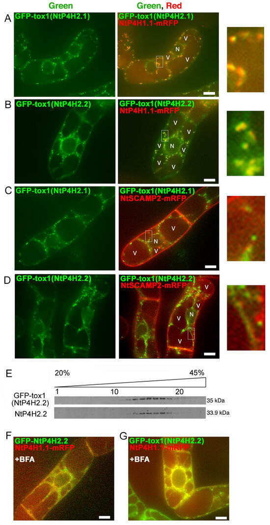 In this work, experiments showing Golgi localization of GFP-tagged type 2 P4H or Tox1 domains were performed by co-expression with RFP-tagged type 1 P4H, NtP4H1.1-mRFP. Our analysis of intracellular localization mechanisms of several Arabidopsis P4Hs indicated that some of the isoforms of P4Hs can localize in the ER when expressed alone, but these can be targeted to the Golgi by the interaction of other Golgi-localizing P4Hs [15]. Therefore, we cannot completely exclude the possibility that the co-expression of NtP4H1.1-mRFP reflects the distribution of these GFP-tagged proteins. However, we think this seems unlikely since GFP-tagged type 2 P4H and Tox1 domains showed a similar distribution when co-expressed with the non-Golgi protein SCAMP2-mRFP (Figure 4A–D, green). In the future, Golgi localization could be concluded by staining the expressing cells with antibodies against endogenous Golgi proteins, such as anti-NtP4H2.2, or by identifying receptors for type 2 P4H and/or Tox1 domains in the Golgi.