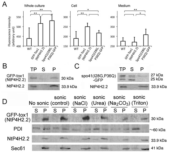 The Tox1 domain increases the membrane association of GFP. (A) Cell and medium distribution of GFP-Tox1 fusion and control. Fluorescence of whole culture, cell, and medium fractions of non-transformed control cells (WT) expressing GFP-Tox1(NtP4H2.2) or spo41(I28G,P36Q)-GFP were measured at 488 nm excitation and 520 nm emission. An average of six independent samples is shown. The error bar indicates the standard deviation. Single and double asterisks indicate significant differences at (p < 0.05) and (p < 0.01), respectively. (B,C) The distributions of spo41(I28G,P36Q)-GFP and GFP-Tox1(NtP4H2.2) in the cell. Tobacco cells expressing either GFP-Tox1(NtP4H2.2) (B) or spo41(I28G, P36Q)-GFP (C) were fractionated as described in the Figure 1B legend, and GFP and control proteins (NtP4H2.2) were detected by immunoblotting using specific antibodies (TP, total protein; S, soluble fraction; P, precipitated fraction). (D) Membrane association of GFP-Tox1. Microsomes isolated from BY-2 cells expressing GFP-Tox1(NtP4H2.2) were sonicated in buffers containing the indicated compounds, then soluble (S) and precipitated (P) fractions were separated by ultracentrifugation. GFP and control proteins (PDI, NtP4H2.2, and Sec61) were detected by immunoblotting using specific antibodies. The migration position of each protein on SDS–polyacrylamide gel is indicated to the right of each panel.