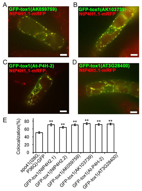 Localizations of GFP fused with the Tox1 domain from type 2 P4H homologs of various plants. The Tox1 domains from rice (AK059759 and AK103739) or Arabidopsis (At-P4H-2 and AT3G28480) were fused with spo41(I28G,P36Q)-GFP and expressed in BY-2 cells expressing NtP4H1.1-mRFP. Confocal overlay images of GFP-Tox1 (AK059759) (A), GFP-Tox1 (AK103739) (B), GFP-Tox1 (At-P4H-2) (C), or GFP-Tox1 (AT3G28480) (D) with NtP4H1.1-mRFP are shown. Bar = 10 µm. (E) Colocalization frequencies of GFP and RFP signals. Data were collected as described in the legend in Figure 3D. Double asterisks indicate a significant difference (p < 0.01). (E) Colocalization frequencies of GFP-Tox1 and RFP signals, as described in the Figure 3D legend. Data are the means ± SD (n = 18). Double asterisks indicate a significant difference between spo41(I28G,P36Q)-GFP and GFP-Tox1 fusion proteins (p < 0.01).
