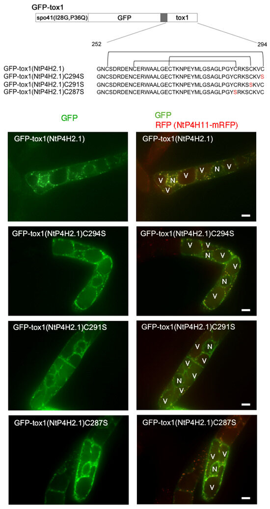Mutations of cysteine residues in the Tox1 domain caused the accumulation of GFP-Tox1 protein in the ER. Structures of GFP fusion constructs with wild-type and mutant Tox1 domains are shown at the top. Predicted disulfide bridges are indicated above the sequence. These proteins were transiently expressed in BY-2 cells expressing NtP4H1.1-mRFP, and fluorescence in the transiently transformed cells was recorded. Confocal images of GFP fluorescence (left) and merged fluorescence of GFP and RFP (right) of representative cells are shown. N, nucleus; V, vacuole. Bar = 10 µm.