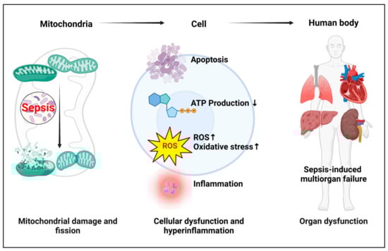 Impact of mitochondrial damage on sepsis-related organ failure. In sepsis, mitochondrial damage leads to increased fragmentation, which boosts apoptotic signaling and impairs the primary function of mitochondria, namely energy production. This failure results in heightened ROS production, exacerbating hyperinflammation. Ultimately, these disruptions contribute to cellular dysfunction and death, culminating in organ dysfunction.
