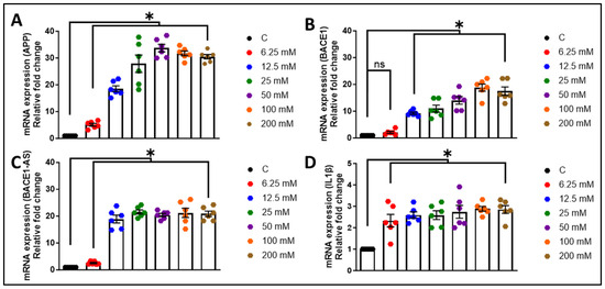 Total RNA from HPAs was extracted utilizing the Quick-RNA MicroPrep kit (R1055, Zymo Research Corporation, Irvine, CA, USA,) according to the manufacturer’s instructions. The qPCR methodology was executed following established procedures [35]. Concisely, a total RNA amount equal to 1 ug was reverse-transcribed to cDNA with the Verso cDNA synthesis kit (AB1453/B, Thermo Fisher Scientific, Waltham, MA, USA), as per the manufacturer’s instructions. The qPCR assays utilized TaqMan probes, and specific primers for lncRNA BACE1-AS (Hs_04232267), BACE1 (Hs_01121195), APP (Hs_00169098), TNF-α (Hs_00174128), IL-1β (Hs_01555410), IL-6 (Hs_00 174131), and GAPDH (Hs_002786624) were acquired from Thermo Fisher Scientific, Waltham, MA, USA. Comparative expression levels were determined by normalizing mean CT values against the housekeeping gene GAPDH, and the 2−ΔΔCT method was used to calculate gene expression.