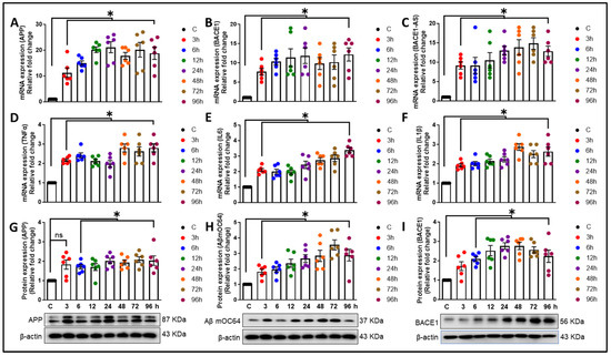 Next, we sought to examine the time-dependent expression (at 3, 6, 12, 24, 48, 72, and 96 h post-ethanol exposure) of AD and inflammatory markers in astrocytes following exposure to 12.5 mM ethanol. As illustrated in Figure 3A–C, exposure to ethanol led to the significant upregulation (* p < 0.05) of the mRNA expression of APP, BACE1, and lncRNA BACE1-AS in HPAs, indicative of astrocytic amyloid generation in a time-dependent manner. Additionally, the proinflammatory cytokines tumor necrosis factor-α (TNFα), interleukin-6 (IL6), and IL1β were also increased (* p < 0.05) in a time-dependent manner after 12.5 mM ethanol exposure (Figure 3D–F). Moreover, ethanol at a concentration of 12.5 mM markedly elevated (* p < 0.05) the protein expression of the APP, Aβ mOC64, and BACE1 in a time-dependent manner in HPAs (Figure 3G–I).