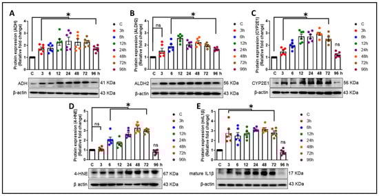 Ethanol mediated the expression of alcohol-metabolizing enzymes, an oxidative stress marker, and proinflammatory cytokines in HPAs. Western blot analysis showing the time-dependent (3–96 h) upregulation of ADH (A), ALDH2 (B), CYP2E1 (C), and the oxidative stress marker 4-HNE (D), as well as the proinflammatory cytokine IL1β (E), in HPAs exposed to ethanol at a 12.5mM dose for the indicated times. β-Actin was used as an internal control. Data are presented as mean ± SEM; n = six biological replicates per group. One-way ANOVA followed by Tukey’s post hoc test was used to determine the statistical significance: * p < 0.05 versus control. Abbreviations: ADH, alcohol dehydrogenase; ALDH2, aldehyde dehydrogenase 2; CYP2E1, cytochrome P450 2E1; 4-HNE, 4-hydroxynonenal; mIL1β, mature interleukin 1β; HPA, human primary astrocyte.