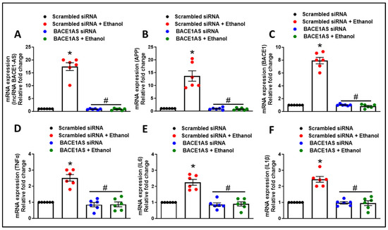 Role of lncRNA BACE1-AS in ethanol-induced astrocytic amyloidosis and proinflammatory cytokine production. qPCR showing mRNA expression of lncRNA BACE1-AS (A), APP (B), and BACE1 (C), as well as the proinflammatory cytokines TNFα (D), IL6 (E), IL1β (F), in HPAs transfected with either BACE1-AS or scrambled siRNA following exposure to ethanol (12.5 mM; 24 h). GAPDH was utilized as an internal control. The data are presented as mean ± SEM; n = six biological replicates per group. One-way ANOVA with Tukey’s post hoc test was applied to assess statistical significance: * p < 0.05 versus control, # p < 0.05 versus ethanol. Abbreviations: APP, amyloid precursor protein; Aβ, amyloid beta; BACE1, β-site-cleaving enzyme; BACE1-AS, BACE1-antisense transcript; TNFα, tumor necrosis factor α; IL-6, interleukin-6; IL1β, interleukin-1β; HPA, human primary astrocyte; qPCR, quantitative polymerase chain reaction.