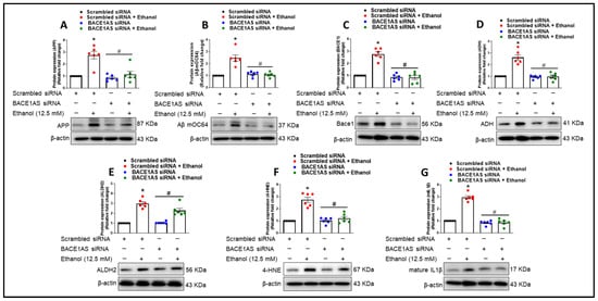 The role of lncRNA BACE1-AS in ethanol-induced astrocytic amyloidosis, alcohol metabolism, oxidative stress, and proinflammatory cytokine production. Western blot analysis demonstrating the expression of APP (A), Aβ mOC64 (B), and BACE1 (C), ADH (D), ALDH2 (E), and the oxidative marker 4-HNE (F), as well as the proinflammatory cytokine IL1β (G), in HPAs transfected with either lncRNA BACE1-AS or scrambled siRNA. β-Actin was utilized as an internal control. For BACE1 (C) and mIL1β (G), after developing mILb, the same membrane was reprobed with BACE1; thus, both proteins have similar β-actin. The data are presented as mean ± SEM; n = six biological replicates per group. One-way ANOVA with Tukey’s post hoc test was applied to assess statistical significance: * p < 0.05 versus control, # p < 0.05 versus ethanol. Abbreviations: APP, amyloid precursor protein; Aβ, amyloid beta; BACE1, β-site-cleaving enzyme; BACE1-AS, BACE1-antisense transcript; ADH, alcohol dehydrogenase; ALDH2, aldehyde dehydrogenase 2; 4-HNE, 4-hydroxynonenal; mIL1β, mature interleukin-1β; HPA, human primary astrocyte.