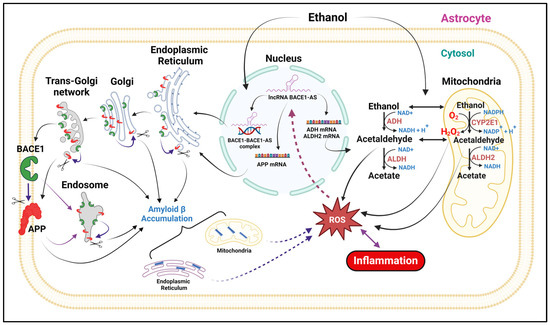 Exposure to alcohol leads to the increased expression and accumulation of the neurotoxic Aβ precursor protein—APP—and the cleaving enzyme BACE1 in HPAs. In parallel to the production of amyloids, key alcohol-metabolizing enzymes—ADH, ALDH2, and CYP2E1—were also shown to be upregulated by alcohol exposure in astrocytes. Further, in the present study, it was demonstrated that lncRNA BACE1-AS can regulate the APP and BACE1 along with alcohol-metabolizing enzymes in astrocytes. After translation, both proteins are present in the endoplasmic reticulum, trans-Golgi network, endosome, and plasma membrane, where they contribute to Aβ production [6,45]. Following its generation, Aβ accumulates in different cellular organelles, such as mitochondria [46], the ER [47,48,49], the trans-Golgi network (TGN) [50], post-TGN secretory vesicles [47], endosomes [51], lysosomes [52], multivesicular bodies (MVBs) [53], and the cytosol [54,55]. Moreover, these neurotoxic amyloids in the mitochondria and endoplasmic reticulum, in coordination with alcohol metabolites like acetaldehyde, lead to oxidative stress and inflammation [56,57,58]. Additionally, in turn, via a positive feedback mechanism, ROS may activate lncRNA BACE1-AS and heighten the response to alcohol, thus implicating the therapeutic potential of lncRNA BACE1-AS inhibitors (Figure 7).