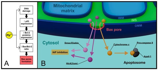 Lead and mitochondria in the intrinsic pathway of apoptosis. Critical changes in the cell initiated by lead (e.g., DNA damage) contribute to the activation of the intrinsic pathway. In addition, lead modifies the expression of Bcl-2 family proteins, increasing the importance of the pro-apoptotic protein Bax (A). Once it reaches mitochondrial localization, Bax oligomerizes and forms pores in the OMM that allow controlled ejection of apoptogenic factors from the IMS into the cytoplasm (B). (IAP—inhibitors of apoptosis proteins, Apaf-1—apoptotic peptidase activating factor 1, IMM—inner mitochondrial membrane, OMM—outer mitochondrial membrane, IMS—intermembrane space).