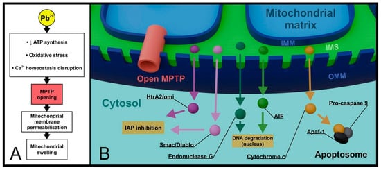 Lead and MPTP in late apoptosis and necrosis. Extensive changes in the metabolism of a lead-exposed cell led to the opening of mitochondrial MPTPs. Dramatically increased permeability of the OMM is accompanied by mitochondrial swelling (A) and non-selective release of apoptogenic factors from the IMS into the cytoplasm (B). (MPTP—mitochondrial permeability transition pore, IAP—inhibitors of apoptosis proteins, AIF—apoptosis inducing factor, Apaf-1—apoptotic peptidase activating factor 1, IMM—inner mitochondrial membrane, OMM—outer mitochondrial membrane, IMS—intermembrane space).