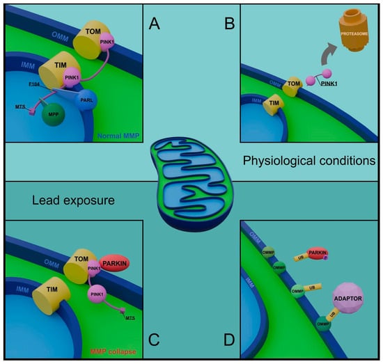 Role of PINK1 and PARKIN in healthy and damaged mitochondria. Normal mitochondrial membrane potential (MMP) allows PINK1 to be coupled to the translocases of both membranes (TOM, TIM) and to proceed with changes in the structure of the PINK1 chain (A). The processed protein is released into the cytoplasm and degraded in the proteasome, reflecting optimal mitochondrial conditions (B). Loss of membrane potential, accompanying pathological changes initiated by lead, determines the permanent binding of PINK1 to OMM and the recruitment of PARKIN protein from the cytoplasm (C). Phosphorylated PARKIN performs numerous ubiquitinations of OMM proteins, preparing the damaged mitochondrion for mitophagy (D). (TOM—translocase of the outer membrane, TIM—translocase of the inner membrane, PINK1—PTEN induced kinase 1, PARL—PINK1/PGAM5 associated rhomboid-like protease, MTS—mitochondrial targeting sequence, MPP—mitochondrial processing peptidase, MMP—mitochondrial membrane potential, UB—ubiquitin, OMMP—outer mitochondrial membrane protein, IMM—inner mitochondrial membrane, OMM—outer mitochondrial membrane).