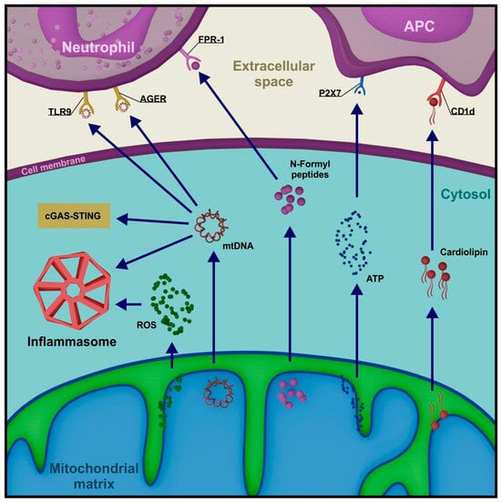 The release of mitochondrial molecules into the extracellular space, most commonly occurring with cell death, stimulates cellular immune response mechanisms. In this environment, mtDNA exhibits chemotactic properties by binding to certain PRRs present on neutrophil membranes (TLR9 and AGER—advanced glycosylation end-product receptor), primarily associated with bacterial DNA binding [126]. Strong activators of neutrophils also include N-formyl peptides from the matrix, which utilize the dedicated FPR-1 membrane receptor [127]. Cardiolipin, a phospholipid in the inner mitochondrial membrane, interacts with antigen-presenting cells (APCs), initiating the expression of a CD1d-like molecule. Cardiolipin can also bind to CD1d on the APC surface, stimulating the activation of a specific subset of T lymphocytes, γδ T cells [128]. Finally, the release of high levels of ATP signals the recruitment of APC precursors by interacting with their P2 × 7 membrane receptor [129] (Figure 4).