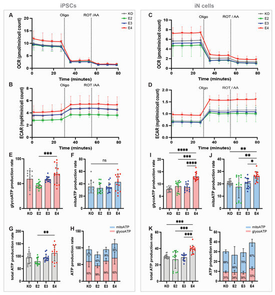 3.2. APOE4 iN Cells Show Higher Mito and Glyco ATP Production Than APOE3, -E2 and -KO Cells
