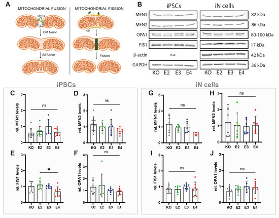 3.3. APOE Genotype Does Not Affect Levels of Mitochondrial Fission and Fusion Proteins in iN Cells