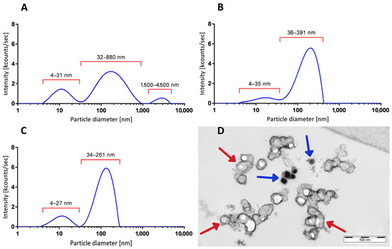 EV size distributions were determined by dynamic light scattering (DLS) using the Litesizer™ 500 Particle Analyzer (Anton Paar Group AG, Graz, Austria, www.anton-paar.com, accessed on 7 July 2024) and corresponding software (Anton Paar Group AG, Graz, Austria, Anton Paar KalliopeTM Professional, version 2.22.1). EV sediments (50 µL) were diluted 1:10 in DPBS (1X, Thermo Fisher Scientific Inc., Waltham, MA, USA, www.thermofisher.com, accessed on 8 July 2024), and briefly vortexed. Next, 60 µL of the PBS-diluted specimen was analyzed in low-volume cuvettes, UVette® (Eppendorf SE, Hamburg, Germany, www.eppendorf.com, accessed on 7 July 2024). The temperature was set to 25 °C, and the optical filter was selected automatically. The results were documented from a maximum of 60 individual measurements.