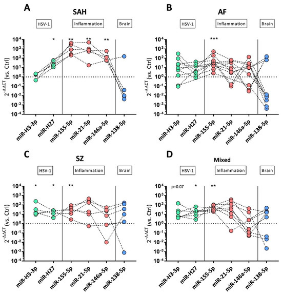 SAH patients were unique in presenting very low levels of viral miR-H3-3p (Figure 4A). The highest miR-H3-3p levels were detected in individual AF patients (Figure 4B); however, miR-H3-3p was significantly elevated in patients with SZ (Figure 4C). Viral miR-H27 was elevated in all groups except AF (Figure 4B).